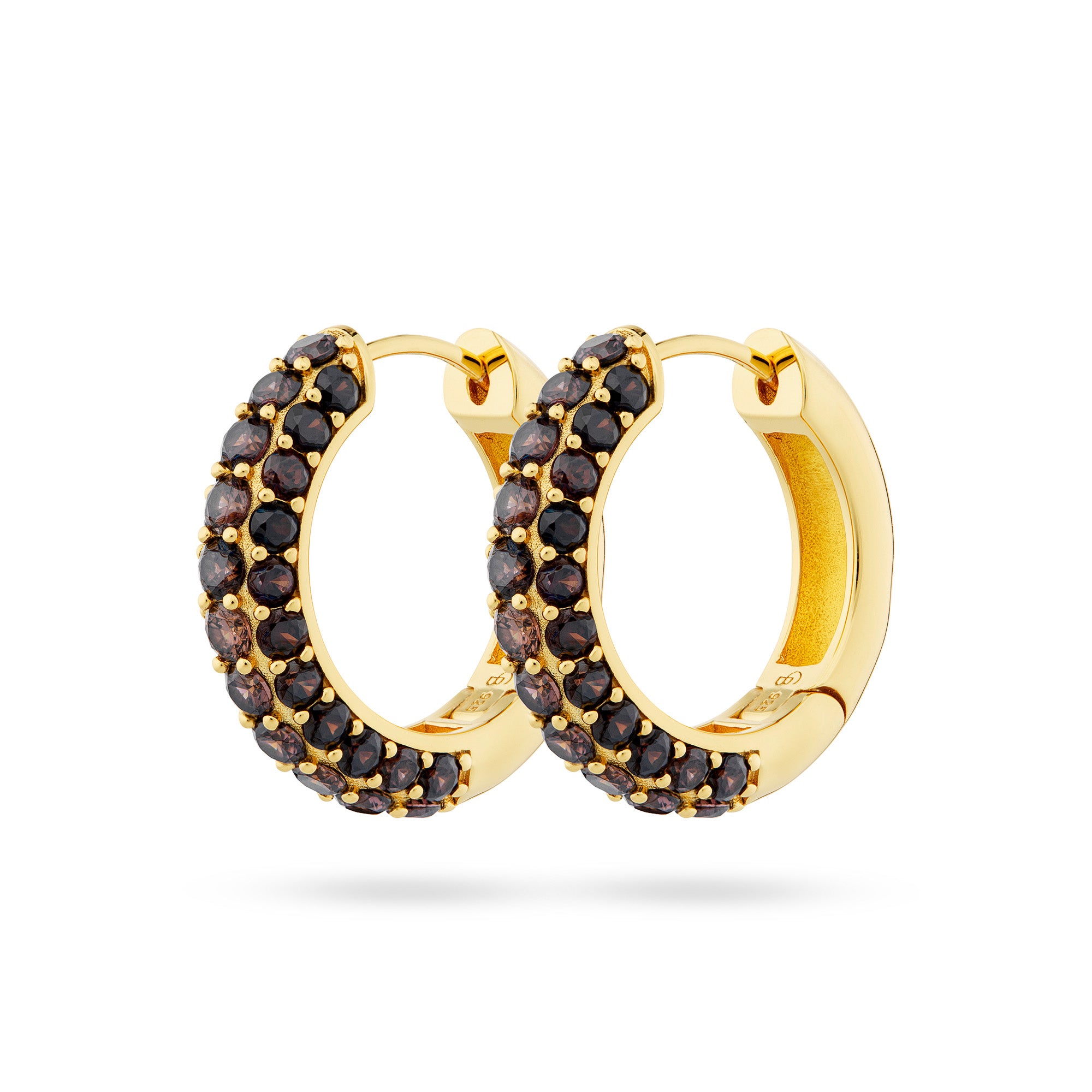 Timeless Chunky Hoops are cast in Gold Plated Sterling Silver /Sterling silver set with Smoky Quartz stones.